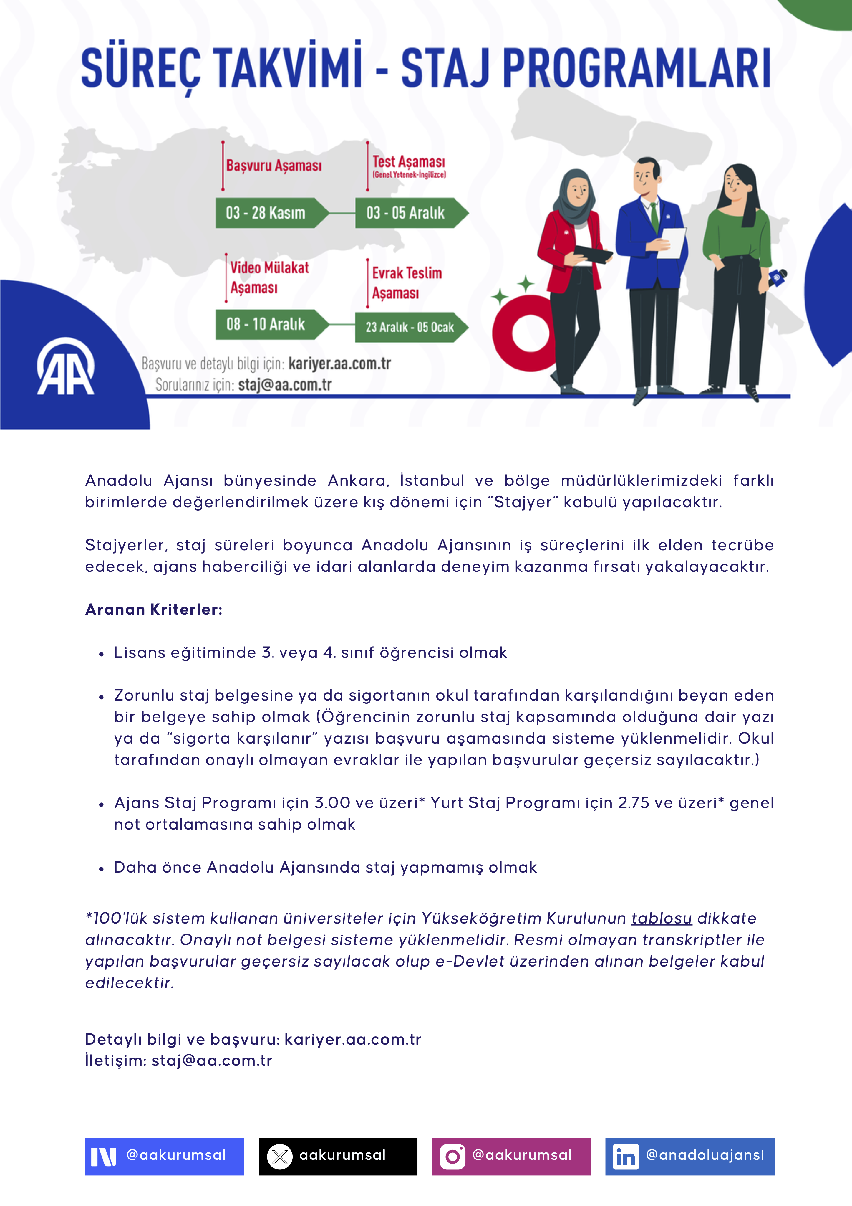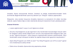 Anadolu Ajansı tarafından Ankara, İstanbul ve bölge müdürlüklerinde bulunan farklı birimlerde görevlendirilmek üzere 2025 kış dönemi için stajyer kabulü yapılacaktır.